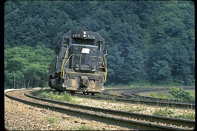 a helper set, consisting of SD45 6219 and SD35 6000, drifts downhill on their way back to Altoona. To the right