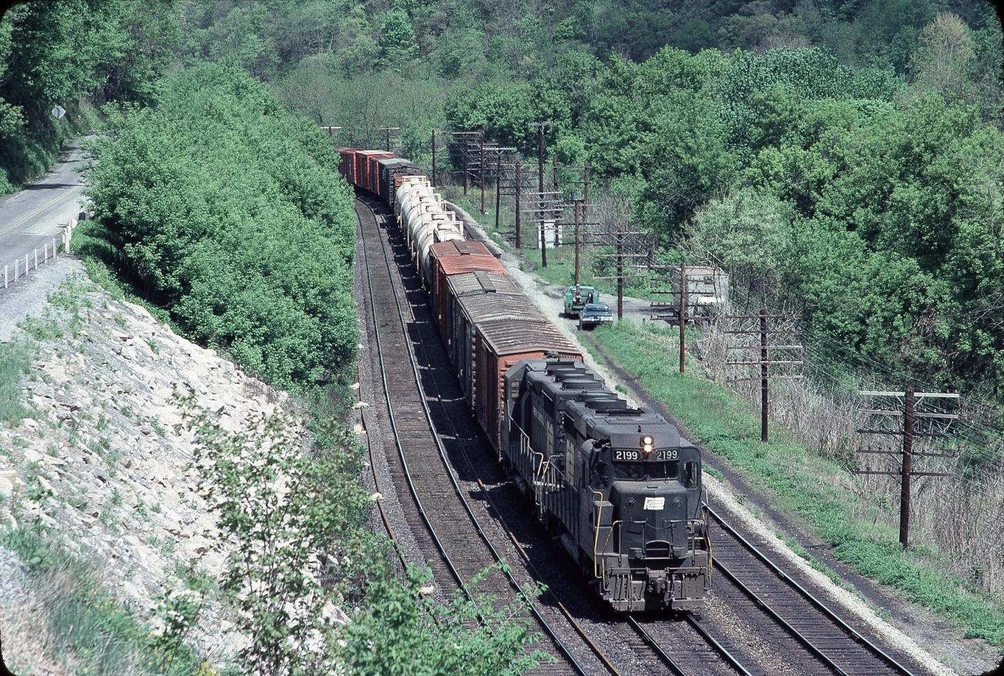 GP30 2199 leads an eastbound train on Track #2 through Spruce Creek, PA, in May 1976.