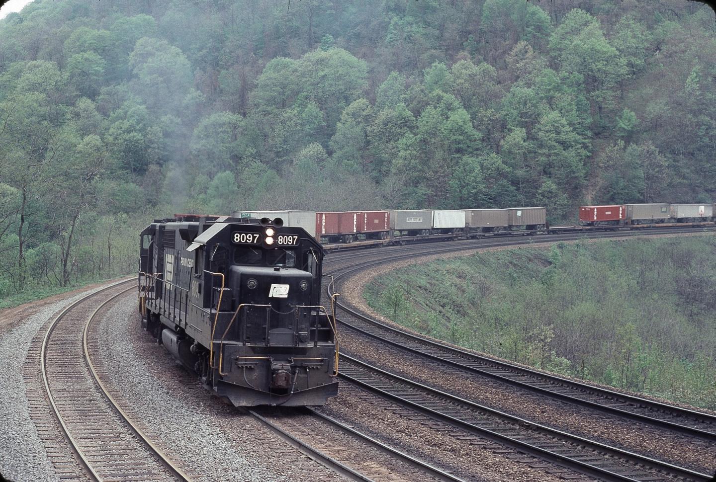 PC 8097 leads a westbound piggyback train uphill around the curve in May 1976.
