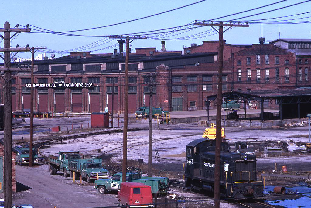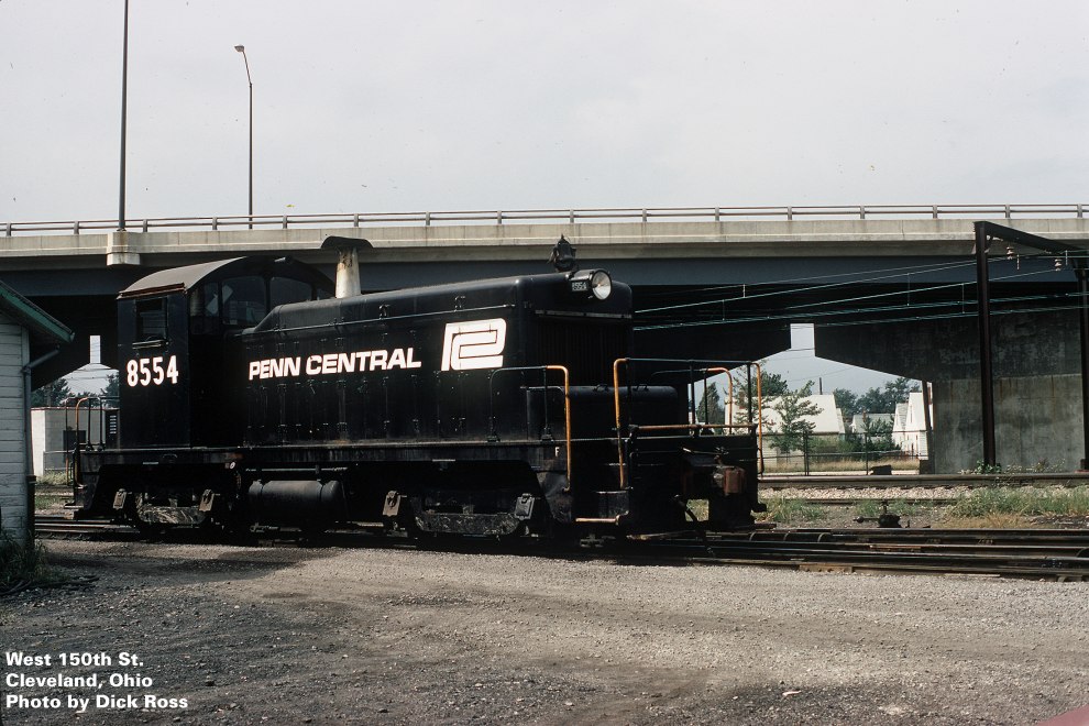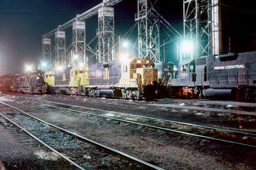 On an unknown date, Cleveland Electric Illuminating GP38-2s 101, 106, and 107 share the spotlight at the Collinwood engine terminal with other PC motive power. CEI leased nine GP38-2s, numbered 100-108, for use on coal trains to their power plants, similar to Detroit Edison, as Penn Central could not always provide reliable motive power. The colorful locomotives were frequently seen around Cleveland during the PC and Conrail eras. They were finally returned to their lessor in 1997, who sent their to VMV and had them rebuilt. They now work for Union Pacific today.