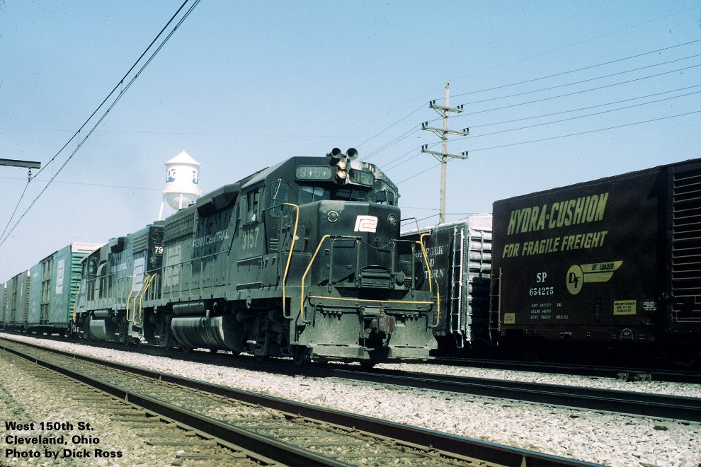 An ex-NYC GP40 3093 mates with a PC SD45 at Collinwood Yard in March 1970. The Eaton smokestack in the background still
